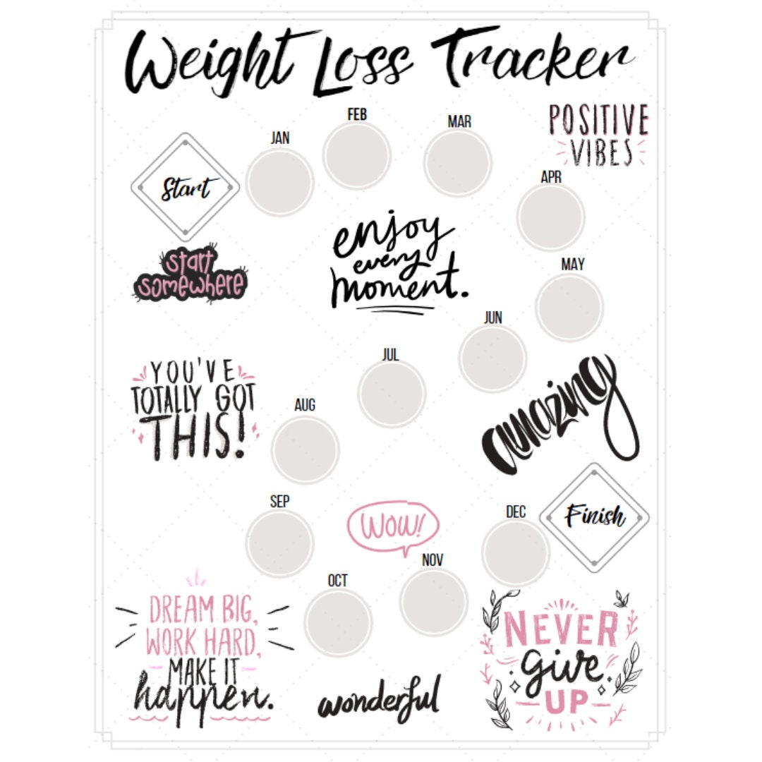 This digital PDF download is a printable weight loss tool for keeping track of your health goals. It has open circles for you to fill in by pound, two pounds, or whatever works for you! The boxes can be colored in as they get accomplished. This weight loss tracker is loaded with positive quotes to keep you motivated.